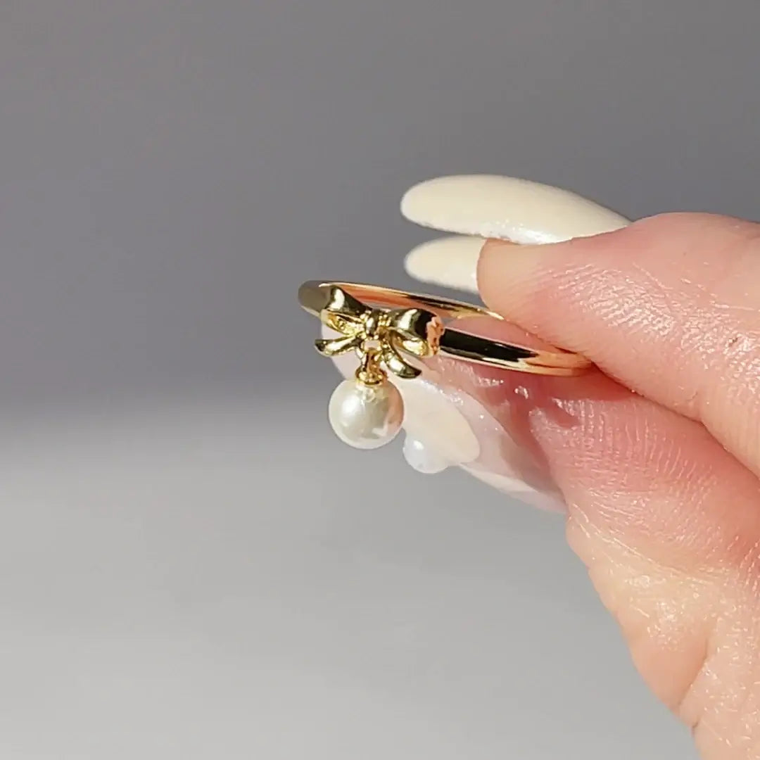 Adorable Pearl Dangle Gold Bow Tie Ring